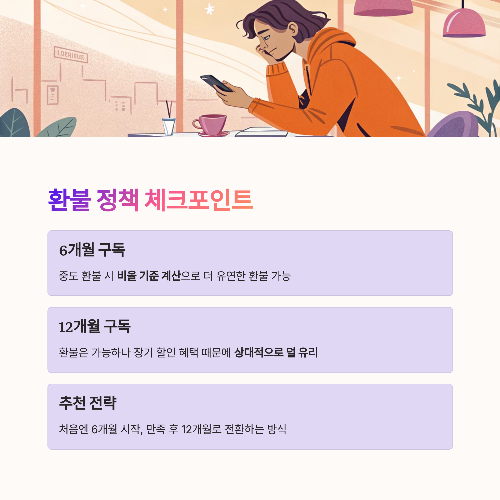 - 12개월도 환불 가능하지만, 장기 할인 혜택이 있기에 조금 덜 유리할 수 있음